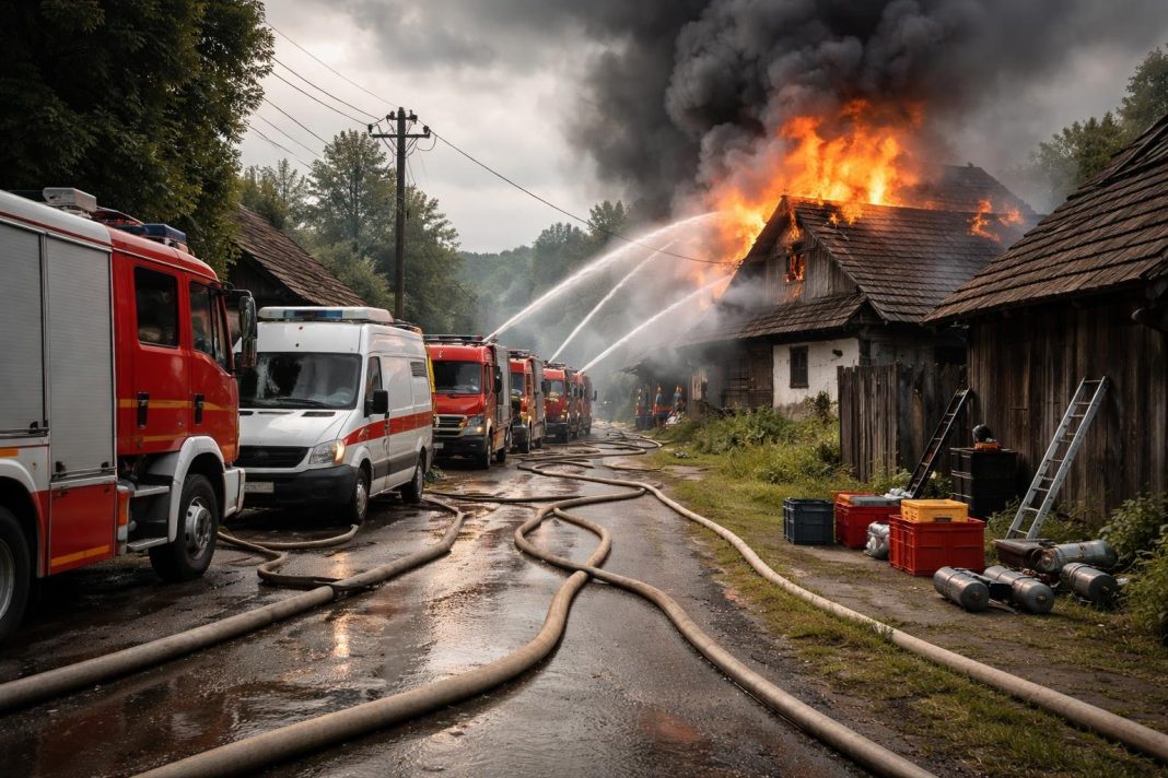 Actualitatea Vranceana Incendiu de proporții la Soveja: 11 case din lemn cuprinse de flăcări